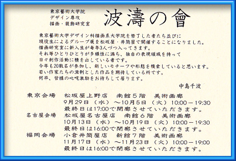 毎年都内から始まります「波濤の會」は昨年まで銀座松坂屋様で行われていましたが、新たに今年度からは上野に会場を移し、描画装飾研究室の多くの作家が参加しています。