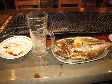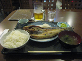 夕食前は漁港近くの定食屋でほっけ定食&ビールで一杯(飲んでばっか)